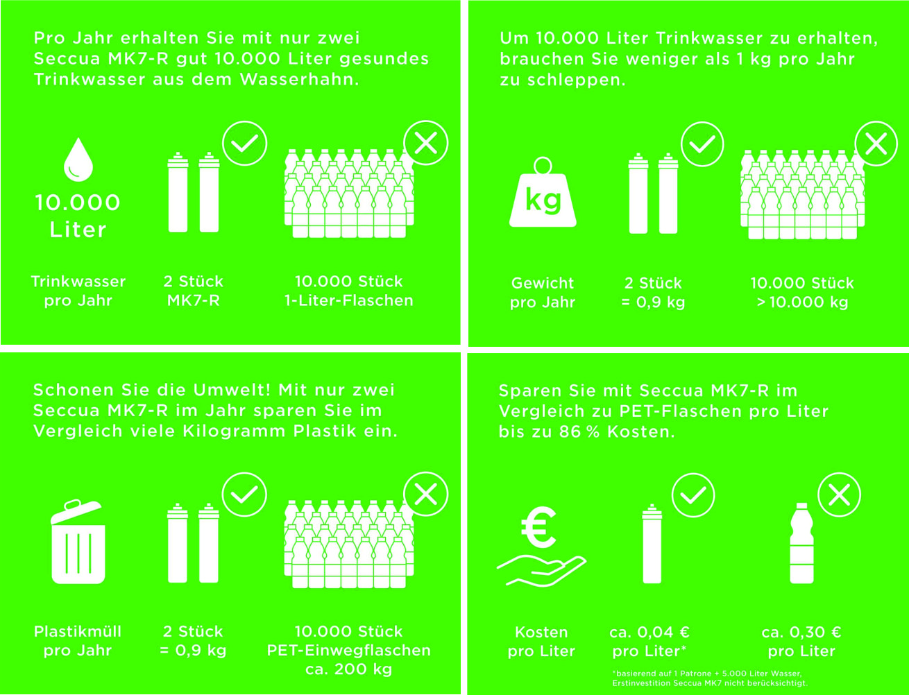 Mit dem Seccua MK7 Filter erreichen wir durch die 3-Stufen-Mikrofiltration Carbonblock (Wasseraufbereitung) ausgezeichnete Werte auch als lokale Untertischmontage für die Küche mit hinreichende Durchflussmenge. Kompatibel auch mit unserem Water Vital Charge.